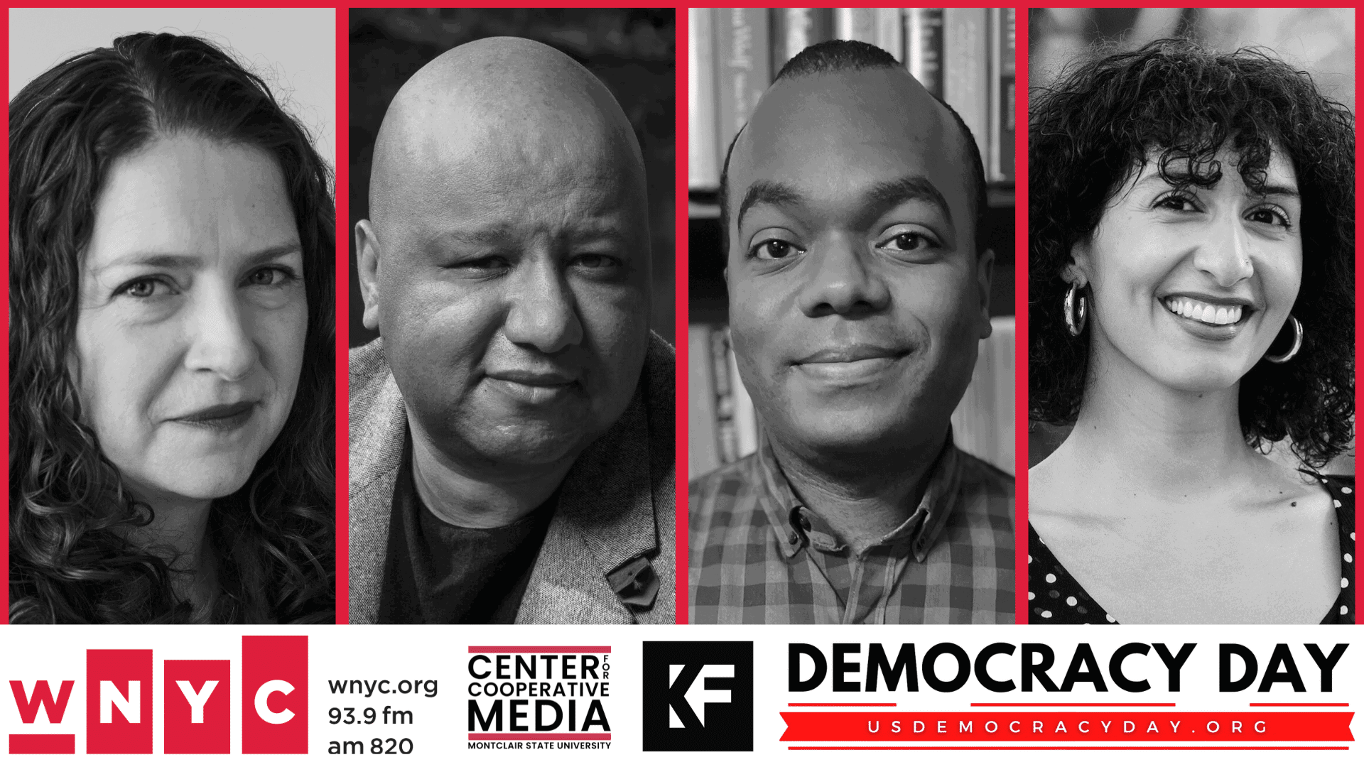 Four black and white portrait photos showing a woman with wavy hair, a bald man in a suit, a Black man in a checkered shirt, and a woman with curly hair smiling. Below are logos for WNYC, Center for Cooperative Media at Montclair State University, KF, and Democracy Day with the website usdemocracyday.org.
